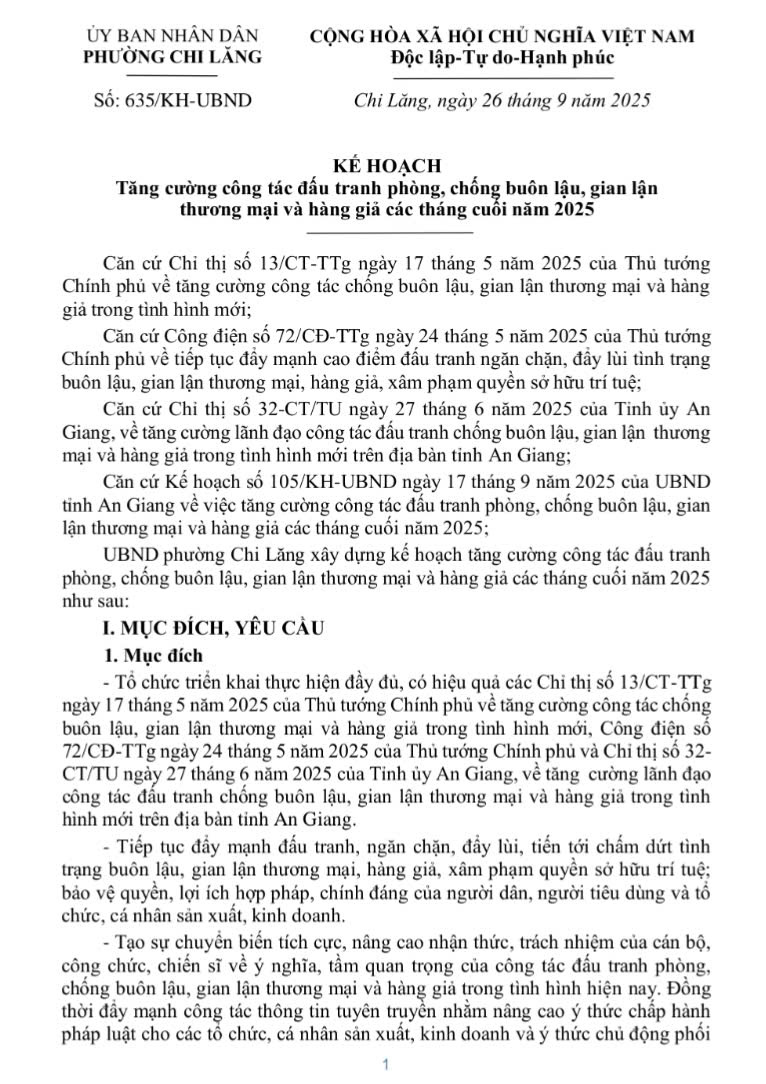 UBND phường Chi Lăng vừa ban hành Kế hoạch số 635/ KH-UBND ngày 26/9/2015 về tăng cường công tác đấu tranh phòng, chống buôn lậu, gian lận thương mại và hàng giả các tháng cuối năm 2025 trên địa bàn.