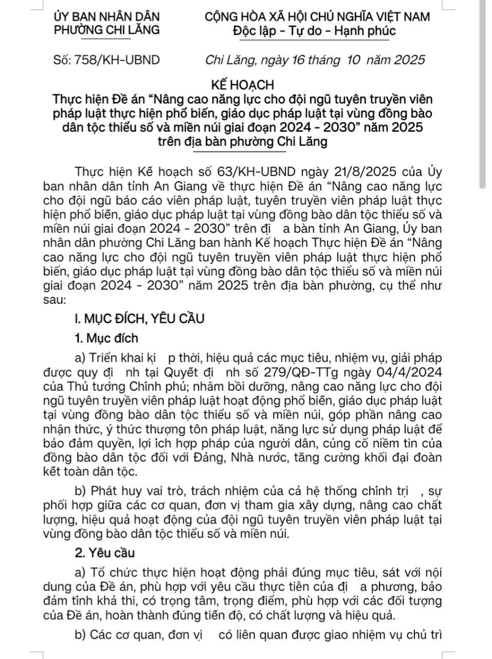 UBND phường Chi Lăng vừa triển khai kế hoạch 758/KH-UBND, ngày 16/10/2025 về Thực hiện Đề án “Nâng cao năng lực cho đội ngũ tuyên truyền viên pháp luật thực hiện phổ biến, giáo dục pháp luật tại vùng đồng bào dân tộc thiểu số và miền núi giai đoạn 2024 - 2030” năm 2025 trên địa bàn khi thực hiện mô hình chính quyền địa phương hai cấp .