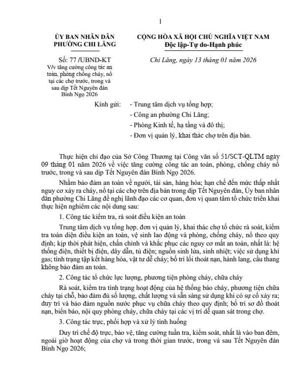 Ngày 13/01/2026, đồng chí Chủ tịch UBND phường Chi Lăng - Lê Ngọc Tấn đã ký ban hành văn bản số 77 /UBND-KT về việc tăng cường công tác an toàn, phòng chống cháy, nổ tại các chợ trước, trong và sau dịp Tết Nguyên đán Bính Ngọ 2026.