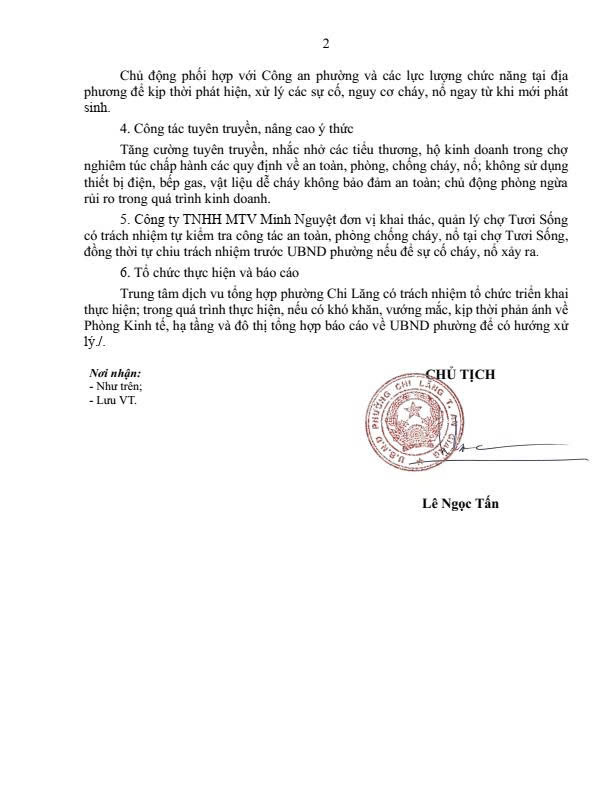 Đơn vị khai thác, quản lý chợ Tươi Sống có trách nhiệm tự kiểm tra công tác an toàn, phòng chống cháy, nổ tại chợ Tươi Sống, đồng thời tự chiu trách nhiệm trước UBND phường nếu để sự cố cháy, nổ xảy ra. Trung tâm dịch vu tổng hợp phường Chi Lăng có trách nhiệm tổ chức triển khai thực hiện; trong quá trình thực hiện, nếu có khó khăn, vướng mắc, kịp thời phản ánh về Phòng Kinh tế, hạ tầng và đô thị tổng hợp báo cáo về UBND phường để có hướng xử lý./.