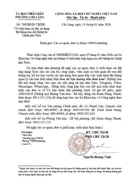 Thực hiện Công văn số 100/SKHCN-CĐS, ngày 07 tháng 01 năm 2026 của Sở Khoa học và Công nghệ tỉnh An Giang về triển khai ứng dụng trao đổi thông tin Chính phủ Trios. Tại Công văn số 79/UBND-VHXH, ngày 13/1/2026 về việc về việc triển khai cài đặt, sử dụng Hệ thống trao đổi thông tin Chính phủ Trios do Phó Chủ tịch UBND phường Chi Lăng Nguyễn Hoàng Vịnh vừa ký ban hành. UBND phường đề nghị các cơ quan, đơn vị triển khai cài đặt ứng dụng Trios cho các cán bộ, công chức, viên chức có liên quan để trao đổi thông tin, hỗ trợ trực tuyến các nội dung liên quan đến việc triển khai Hệ thống quản lý văn bản điều hành Mật (có đính kèm tài liệu hướng dẫn). Không trao đổi nội dung công việc qua các nền tảng xã hội như Zalo, Telegram, Viber, Messenger, WhatsApp,…Đồng thời, tổng hợp báo cáo kết quả triển khai thực hiện của đơn vị về Ủy ban nhân dân phường trước 10 giờ 00 phút, ngày 19/01/2026 (Thông qua Phòng Văn hóa - Xã hội để tổng hợp báo cáo Sở Khoa học và Công nghệ theo quy định.