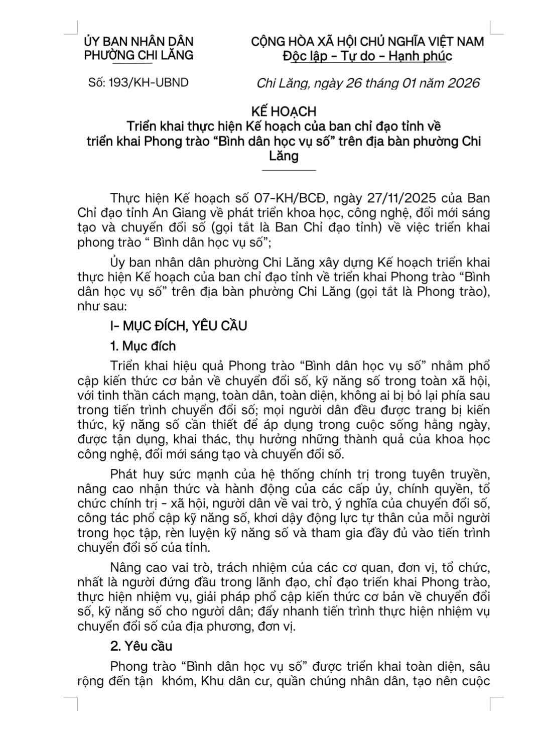Thực hiện Kế hoạch số 07-KH/BCĐ, ngày 27/11/2025 của Ban Chỉ đạo tỉnh An Giang về phát triển khoa học, công nghệ, đổi mới sáng tạo và chuyển đổi số (gọi tắt là Ban Chỉ đạo tỉnh) về việc triển khai phong trào “ Bình dân học vụ số”. Ngày 26/1/2026, UBND phường Chi Lăng đã ban hành Kế hoạch số: 193/KH-UBND về triển khai Phong trào “Bình dân học vụ số” trên địa bàn phường Chi Lăng.